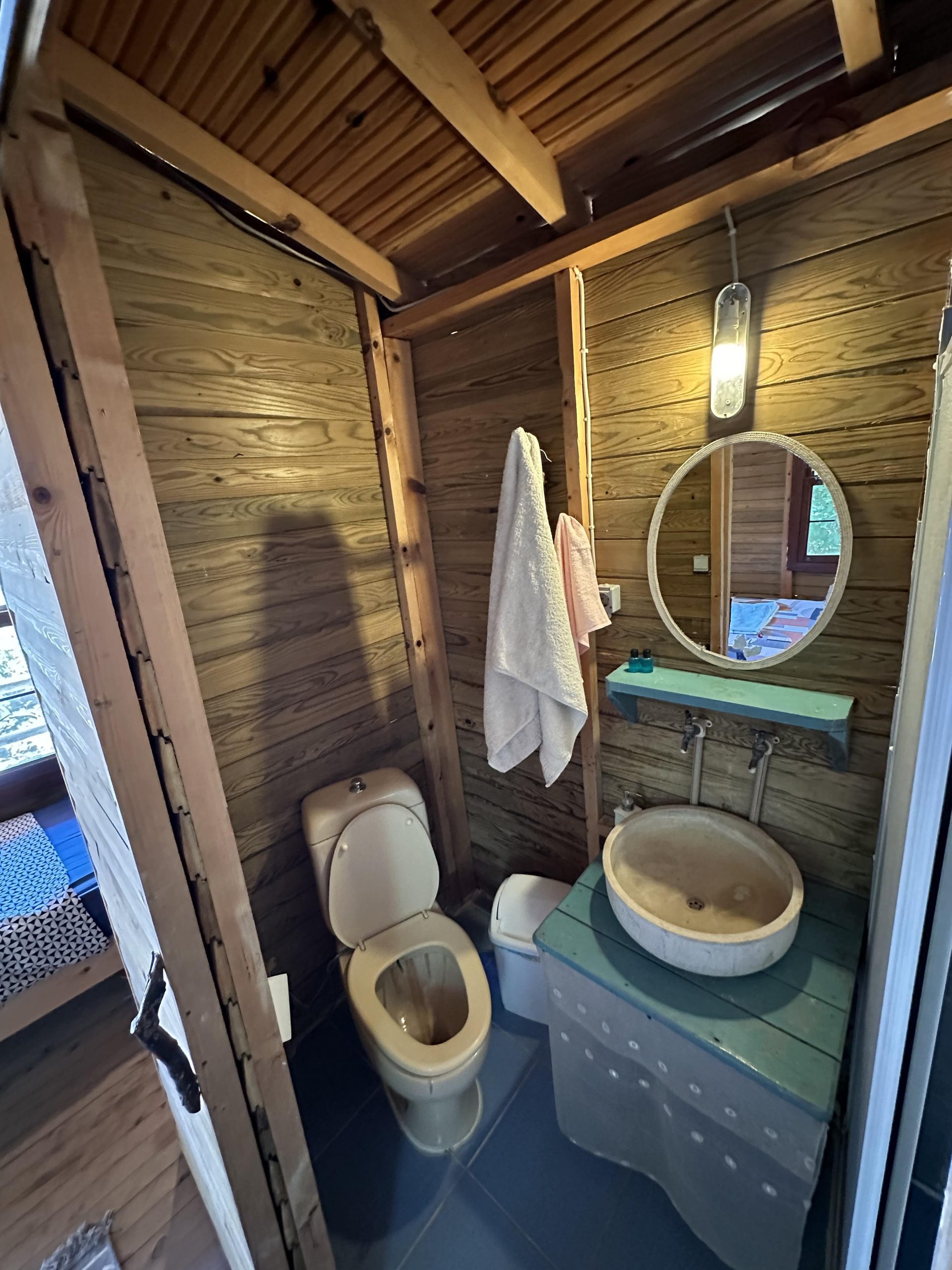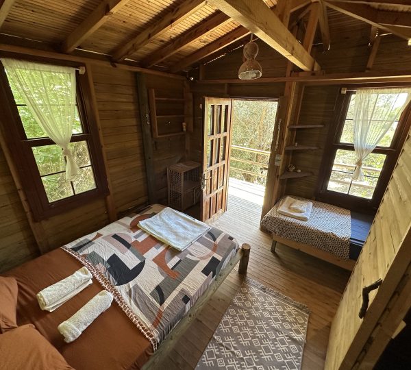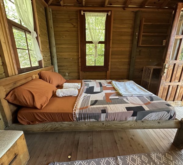 Bungalov ahşap ev, yüksek girişe sahip, sakin ve rahat bir atmosfer sağlayan konforlu bir konaklama imkanı sunar.