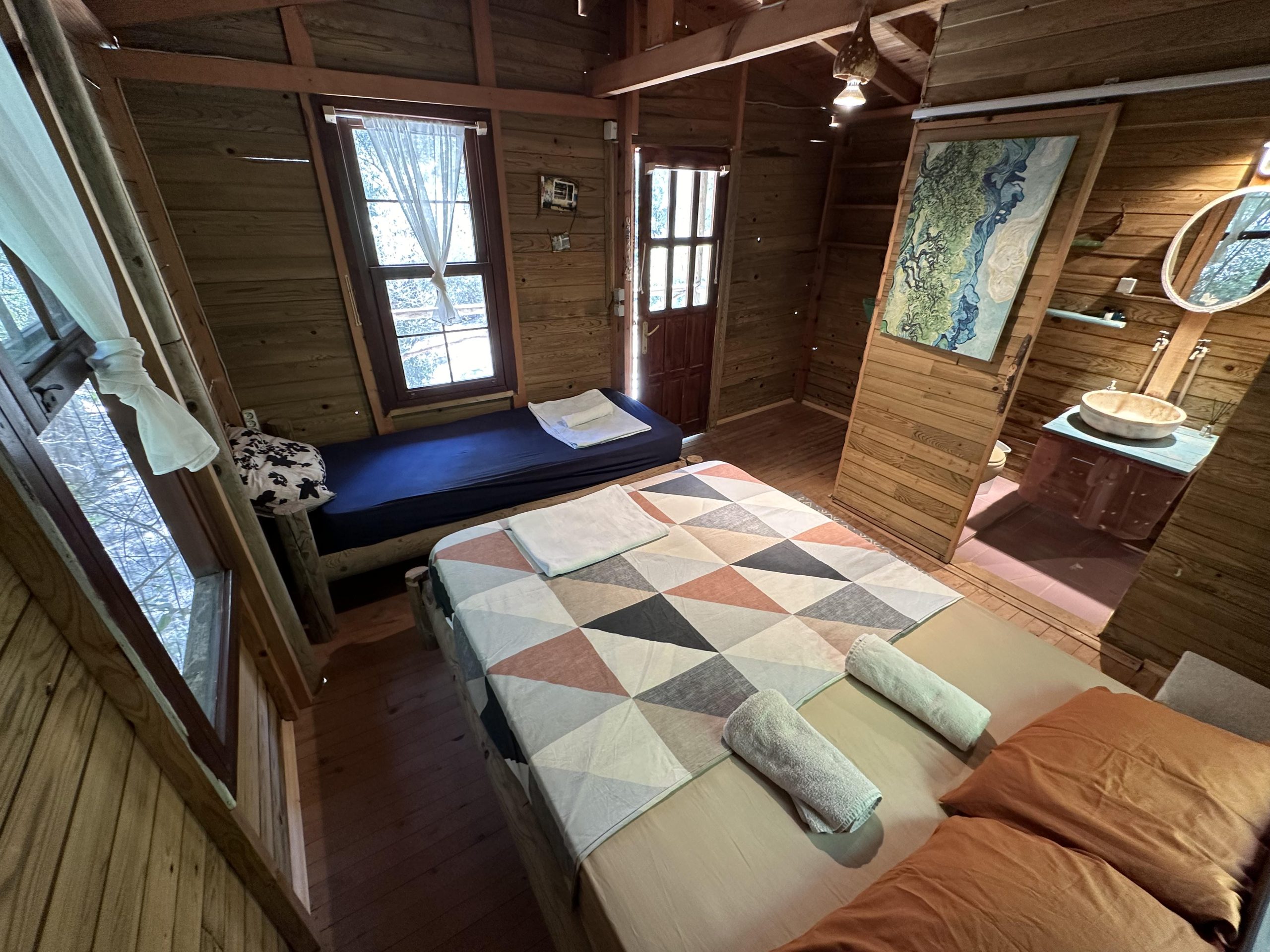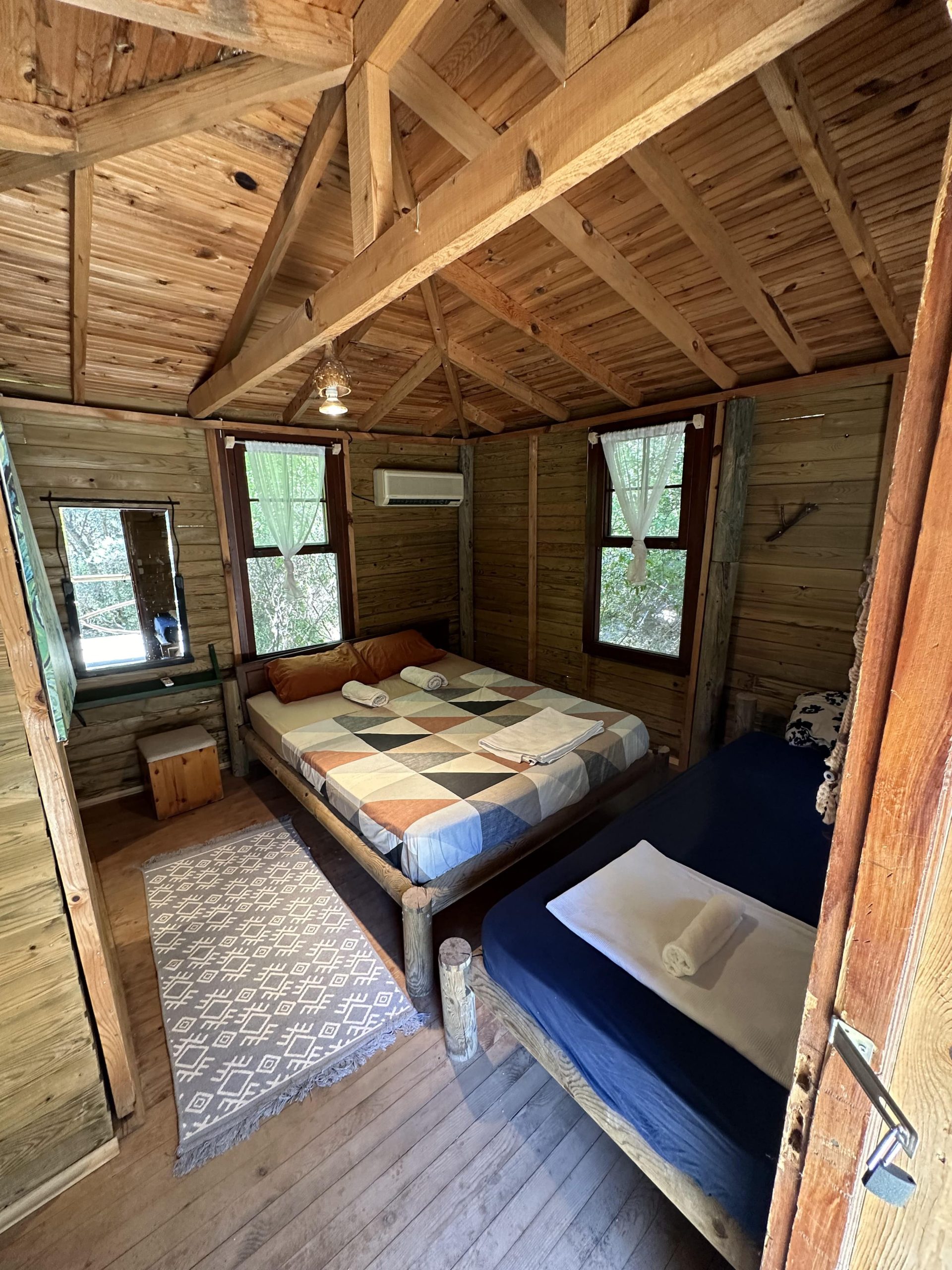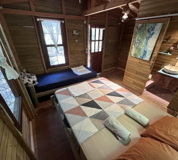 Bungalov ahşap ev, yüksek girişe sahip, sakin ve rahat bir atmosfer sağlayan konforlu bir konaklama imkanı sunar.